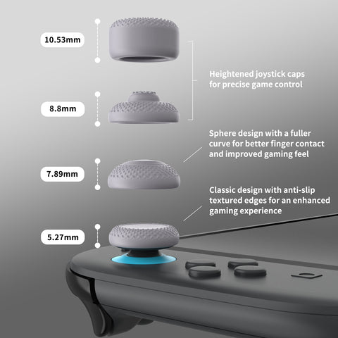 3. The pro thumbstick grip set includes 4 grip styles: classic for comfort, dome for better hold, high-rise for precision in shooters, and raised central dome caps for smooth movement. Each features an anti-slip side texture to improve grip and responsiveness during fast-paced games.